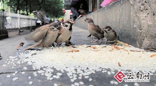 孔霖輝說:“幾天后,我發現店外有幾只麻雀來撿拾我家狗吃剩的東西,十分可憐。想起以前昆明城周邊都有稻田,麻雀不愁吃,現在麻雀在城里生存困難,我就拿出一些米來喂它們,它們也不客氣,見了就吃。一來二去,我們就熟了!