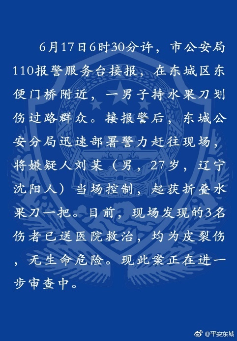 國(guó)際在線報(bào)道:據(jù)北京市公安局東城分局官方微博消息,今早,北京市東城區(qū)有一男子持水果刀劃傷過路群眾,目前已經(jīng)被警方控制。現(xiàn)場(chǎng)發(fā)現(xiàn)的3名傷者均為皮裂傷,無生命危險(xiǎn)。