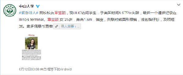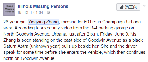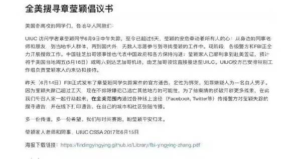 6月15日,伊利諾伊大學(xué)華人學(xué)生學(xué)者聯(lián)合會(huì)(UIUC CSSA)與章瑩穎家人、老師、同事聯(lián)合在各社交平臺(tái)上發(fā)布《全美搜尋章瑩穎倡議書(shū)》,號(hào)召大家在全美范圍內(nèi)擴(kuò)散警方對(duì)中國(guó)訪問(wèn)學(xué)者章瑩穎失蹤的搜尋通告。