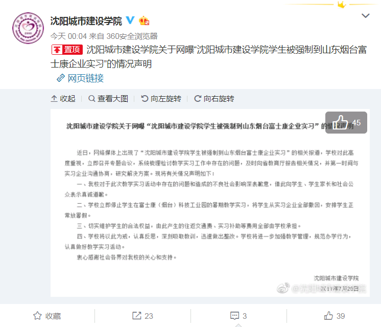 該聲明中寫道:近日,網(wǎng)絡(luò)媒體上出現(xiàn)了“沈陽(yáng)城市建設(shè)學(xué)院強(qiáng)制要求學(xué)生暑期到富士康(煙臺(tái))科技工業(yè)園實(shí)習(xí),實(shí)習(xí)工廠環(huán)境差、工資低、管理混亂“的相關(guān)報(bào)道。我廳高度重視,立即調(diào)查相關(guān)情況,并作出相應(yīng)處理,F(xiàn)聲明如下: