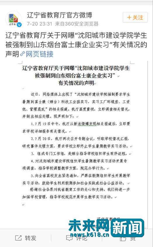 未來(lái)網(wǎng)北京7月21日電(記者 廖瑾)20日晚,遼寧省教育廳發(fā)布聲明,回應(yīng)“沈陽(yáng)城市建設(shè)學(xué)院學(xué)生被強(qiáng)制到山東煙臺(tái)富士康企業(yè)實(shí)習(xí)”一事,要求學(xué)校立即終止學(xué)生暑期教學(xué)實(shí)習(xí)活動(dòng)。
