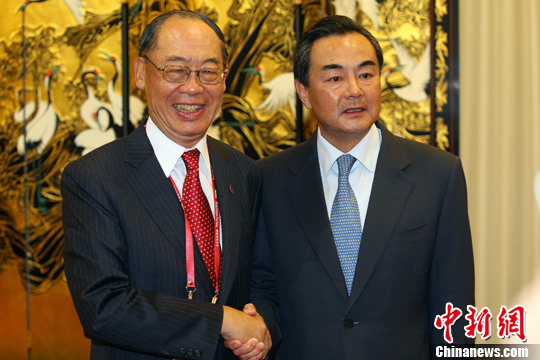 4月15日,中共中央臺辦主任王毅在博鰲為前來出席博鰲亞洲論壇年會的臺灣兩岸共同市場基金會最高顧問錢復一行舉行招待酒會。
