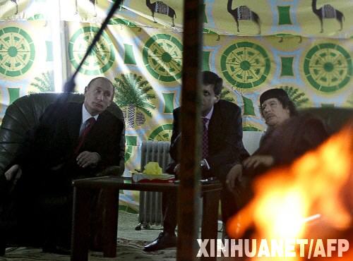 11月1日,俄羅斯總理普京(左一)來到利比亞領導人卡扎菲(右一)搭建在莫斯科克里姆林宮的貝都因人帳篷內會見卡扎菲。卡扎菲愛住帳篷的習慣舉世聞名,他在出訪時往往攜帶一頂帳篷,作為他的旅居之所。卡扎菲10月31日晚抵達莫斯科。 新華社/法新