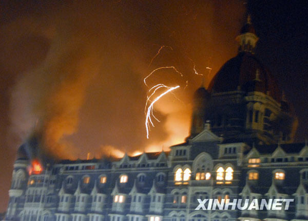 11月27日,印度孟買的泰姬瑪哈酒店遭恐怖襲擊后發(fā)生火災。26日晚間到27日凌晨,印度孟買市中心的火車站、酒店和市政府等多處建筑遭到武裝分子的襲擊,目前已造成至少80人死亡、250多人受傷。 新華社/美聯(lián)