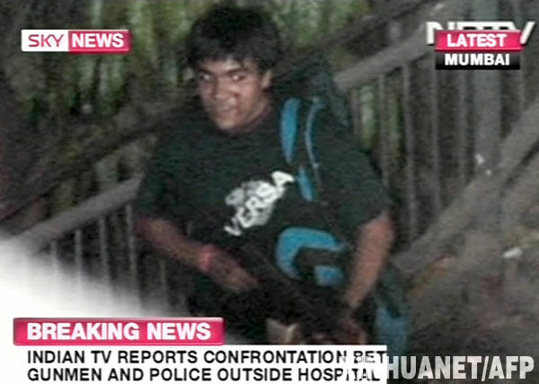 這張11月26日夜間的電視畫面截圖顯示的是一名印度孟買恐怖襲擊嫌疑人。一個名為“德干圣戰者”的組織宣稱對印度孟買26日晚至27日凌晨發生的連環襲擊事件負責。新華社/法新