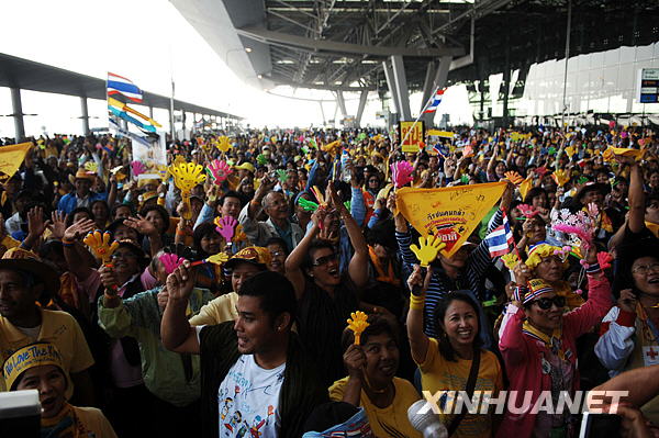 12月3日,泰國(guó)反政府的人民民主聯(lián)盟(民盟)支持者在曼谷素萬(wàn)那普國(guó)際機(jī)場(chǎng)載歌載舞。新華社記者凌朔攝