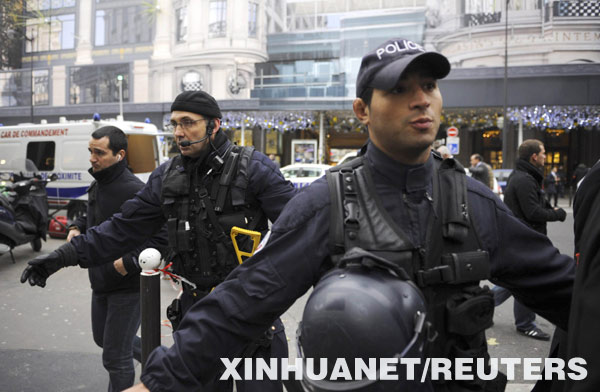 12月16日,法國警察在首都巴黎市中心的春天百貨商場前維持秩序。 新華社/路透