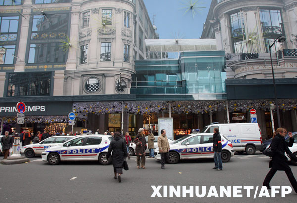 12月16日,數(shù)輛警車停靠在法國首都巴黎市中心的春天百貨商場前。新華社/法新