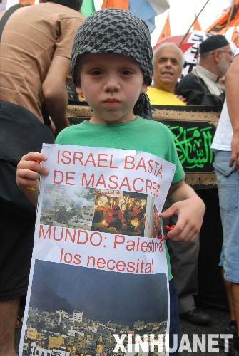 2009年1月7日 阿根廷舉行抗議活動反對以軍入侵加沙 1月6日,一名兒童舉著反戰標語參加在阿根廷首都布宜諾斯艾利斯舉行的反戰游行。阿根廷的阿拉伯移民及當地民眾在布宜諾斯艾利斯市中心舉行示威游行,反對以色列軍隊入侵加沙。 新華社/美洲通訊社