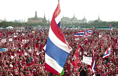 中新網(wǎng)2月1日電 據(jù)香港《文匯報(bào)》報(bào)道,支持泰國(guó)前總理他信的民間組織反獨(dú)裁民主聯(lián)盟(反獨(dú)聯(lián)),1月31日下午在曼谷市中心王家田廣場(chǎng)舉行大規(guī)模集會(huì),指摘總理阿披實(shí)以非法手段奪權(quán),當(dāng)晚又發(fā)出最后通牒,要求政府于15日內(nèi)下臺(tái),否則他們將無(wú)限期抗?fàn)帲⒕嫒羰褂梦淞,政府將過(guò)不了明天。警方估計(jì)有3萬(wàn)至4萬(wàn)人參加集會(huì),當(dāng)局部署5000名警員嚴(yán)密戒備,防范示威者占領(lǐng)總理府。