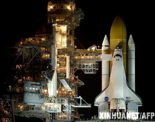 3月14日,在美國佛羅里達州的肯尼迪航天中心,“發現”號航天飛機豎立在發射架上。美國國家航空航天局目前擬定于美國東部時間15日19時43分(北京時間16日7時43分)發射“發現”號航天飛機。 新華社/法新