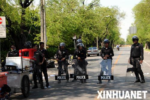 4月14日,幾名泰國警察在曼谷總理府周邊地區執行警戒任務。當天下午,泰國外交部發表公報說,首都曼谷的局勢已經逐步恢復正常。反獨裁民主聯盟(反獨聯)領導人已經向政府方面自首,并要求示威者結束抗議活動。新華社記者黃海敏攝