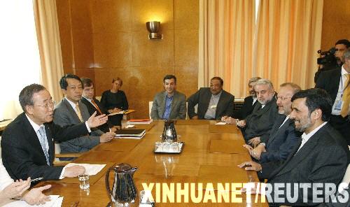 4月20日,聯合國秘書長潘基文(左一)與伊朗總統艾哈邁迪-內賈德(右一)在瑞士日內瓦舉行會談。 新華社/路透