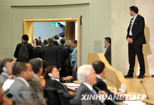 4月20日,在瑞士日內(nèi)瓦,來(lái)自歐盟國(guó)家的代表在伊朗總統(tǒng)艾哈邁迪-內(nèi)賈德發(fā)表講話(huà)期間離開(kāi)會(huì)場(chǎng)。新華社/法新