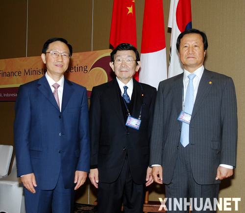 5月3日,在印度尼西亞巴厘島國際會議中心,中國財政部部長謝旭人(左)、日本財務大臣與謝野馨(中)和韓國企劃財政部長官尹增鉉在會談前合影。當天,中日韓三國財長就三方對籌建中的區域外匯儲備庫的出資份額達成共識。 新華社記者岳月偉攝