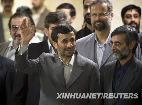 5月8日,在伊朗首都德黑蘭,伊朗總統艾哈邁迪-內賈德(前左)抵達內政部正式登記參加今年6月12日舉行的伊朗第10屆總統選舉。新華社/路透