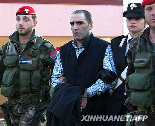 5月10日,在意大利卡拉布里亞地區(qū),當(dāng)?shù)匾粋(gè)黑手黨頭目薩爾瓦托雷·科盧喬(中)被警方逮捕。科盧喬是卡拉布里亞地區(qū)臭名昭著的一個(gè)黑手黨家族頭目,4年前開(kāi)始逃亡,被列為意大利最危險(xiǎn)的30名潛逃者之一。新華社/法新