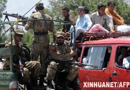 2009年5月17日 巴基斯坦部隊近一個月打死千余名武裝分子 5月17日,在巴基斯坦的馬爾丹,巴軍隊士兵乘坐汽車和逃離家園的難民們相向而過。巴基斯坦內政部長馬利克當日說,4月下旬以來巴基斯坦安全部隊在西北邊境省斯瓦特河谷地區開展的針對塔利班的軍事行動已打死1000多名武裝分子。馬利克還證實,打擊行動已造成當地約110萬人流離失所。 新華社/法新