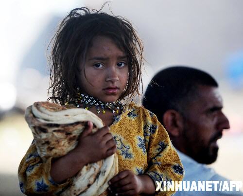 2009年5月17日 巴基斯坦馬爾丹難民營 5月17日,在巴基斯坦馬爾丹一個難民營內,一名因巴部隊對塔利班的軍事打擊行動撤離家園的孩子抱著分配來的食品。巴基斯坦內政部長馬利克17日說,4月下旬以來巴基斯坦安全部隊在西北邊境省斯瓦特河谷地區開展的針對塔利班的軍事行動已打死1000多名武裝分子。馬利克還證實,打擊行動已造成當地約110萬人流離失所。 新華社/法新