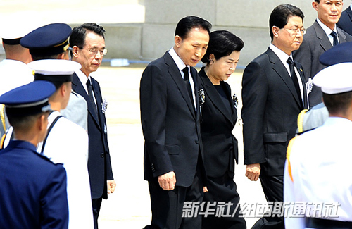 5月29日,韓國總統李明博(中)偕夫人步入首爾景福宮前院,參加在這里舉行的已故前總統盧武鉉的遺體告別儀式。韓國各界當天上午在位于首都首爾市中心的景福宮舉行了規模盛大的前總統盧武鉉遺體告別儀式。 新華社/紐西斯通訊社