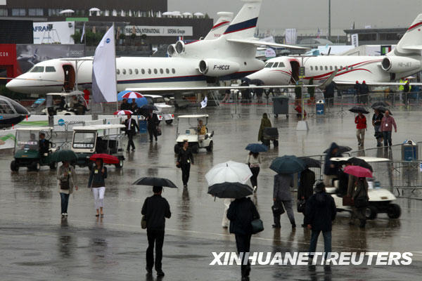 6月15日,在法國巴黎北郊的布爾歇國際展覽中心,人們冒雨參觀第48屆巴黎國際航空航天展。新華社/路透