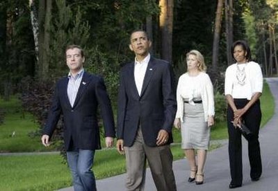 7月6日,俄羅斯總統(tǒng)梅德韋杰夫在莫斯科與到訪的美國總統(tǒng)奧巴馬舉行會(huì)談。奧巴馬當(dāng)日抵達(dá)莫斯科進(jìn)行為期三天的訪問,這是他就任總統(tǒng)以來首次訪問俄羅斯。