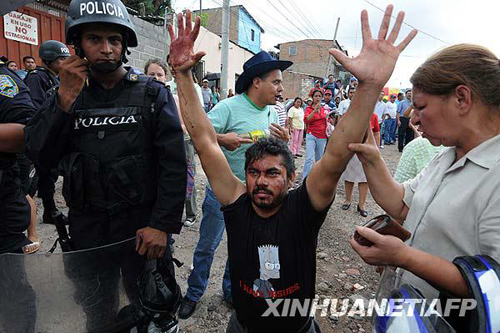 7月30日,在洪都拉斯首都特古西加爾巴,一名示威者遭到軍警的擊打。當天,洪都拉斯被罷免總統塞拉亞的支持者在特古西加爾巴舉行大規模游行,并與當地軍警爆發大規模沖突,多人受傷。新華社/法新
