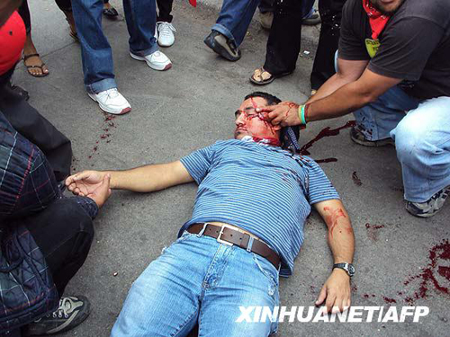 7月30日,在洪都拉斯首都特古西加爾巴,一名示威者試圖為一名頭部中彈的示威者止血。當天,洪都拉斯被罷免總統塞拉亞的支持者在特古西加爾巴舉行大規模游行,并與當地軍警爆發大規模沖突,多人受傷。新華社/法新