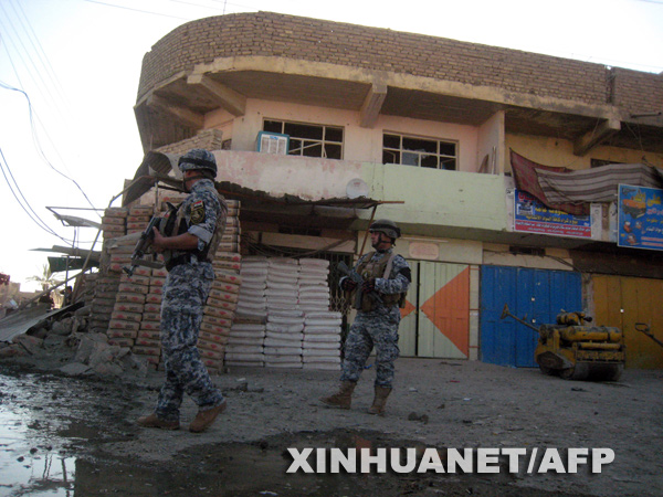 8月10日,在伊拉克首都巴格達的阿米勒社區,兩名伊拉克警察在炸彈爆炸現場警戒。