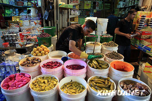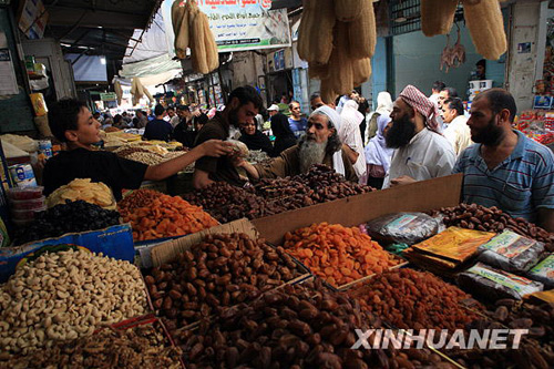 8月20日,在加沙城的一個(gè)市場(chǎng)里,店主出售食品。隨著伊斯蘭教傳統(tǒng)齋月的臨近,巴勒斯坦穆斯林開始為齋月的到來(lái)儲(chǔ)備食物,提前做好準(zhǔn)備。新華社發(fā)(納賽爾攝)