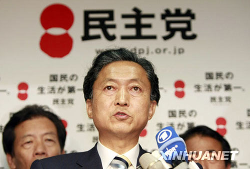 8月31日,在日本東京民主黨總部,民主黨黨首鳩山由紀夫(前)在結束與黨內高層舉行的會議后,接受媒體訪問。新華社記者任正來攝