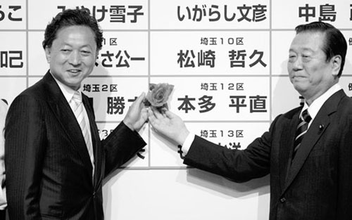 小澤一郎(右)是民主黨眾議院勝選的功臣。圖為他和準首相鳩山由紀夫共同把玫瑰花插在當選的民主黨候選人名字上