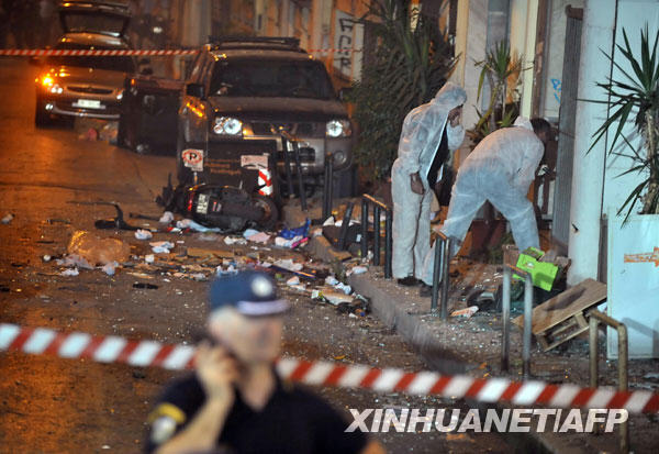 10月2日,警方在希臘雅典的爆炸現場調查。當日,一枚小型炸彈在有希臘總理卡拉曼利斯和大批支持者參加的競選集會上爆炸。當地警方官員說,爆炸造成財產損失但未傷人。新華社/法新