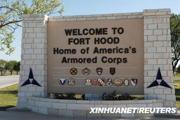 這張未標(biāo)明日期的照片顯示的是美國得克薩斯州胡德堡陸軍基地大門。新華社/路透