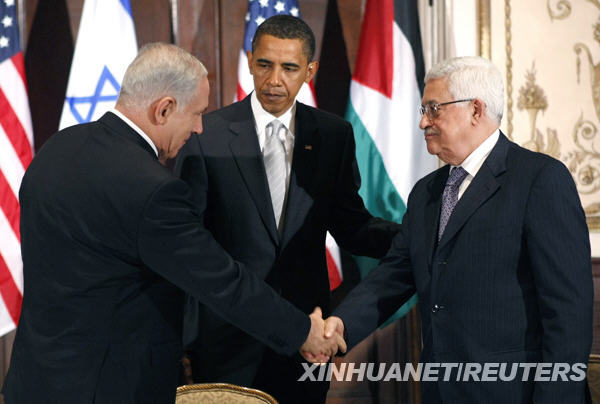 資料圖片: 9月22日,在美國紐約,美國總統奧巴馬(中)與以色列總理內塔尼亞胡(左)和巴勒斯坦民族權力機構主席阿巴斯舉行三方會談。新華社/路透