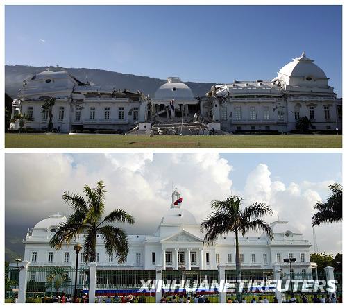 這張拼版照片顯示位于海地首都太子港的海地總統府地震前后的對比(上圖攝于2010年1月13日,下圖攝于2006年5月11日)。聯合國安理會當天發表聲明,呼吁國際社會為發生嚴重地震災害的海地提供幫助。根據中國地震臺網測定,海地當地時間12日下午發生里氏7.3級強烈地震,造成首都太子港大量房屋受損或倒塌。當地人士認為,地震可能造成大量人員傷亡。新華社/路透
