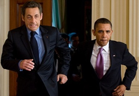 法國總統(tǒng)薩科齊和美國總統(tǒng)奧巴馬跑進白宮新聞發(fā)布會現(xiàn)場