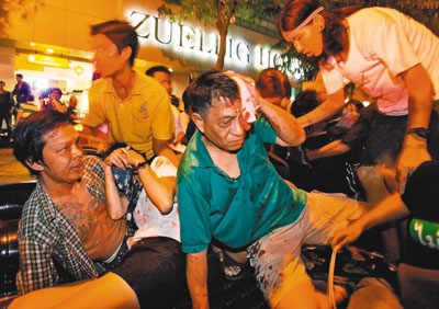 北京時(shí)間晚上9點(diǎn)左右,是隆路(Silom)先傳出三起爆炸,其中一枚榴彈攻擊色拉當(dāng)(Sala Daeng)高架鐵路(天鐵)站,造成多名乘客受傷,包括三名外國(guó)人。第四枚榴彈在五星級(jí)Dusit Thani 酒店旁邊的行人路爆炸,第五枚在盤(pán)谷銀行附近爆炸。爆炸發(fā)生時(shí),數(shù)以百計(jì)親政府示威者正發(fā)起游行,要求紅衫軍停止在曼谷的示威行動(dòng)。泰國(guó)軍方發(fā)言人訕森說(shuō),所有爆炸都是由M79榴彈發(fā)射器造成。