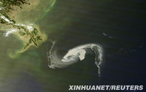 這張4月30日的衛星照片顯示,墨西哥灣石油鉆井平臺爆炸后泄露的原油漂浮到美國路易斯安那州海岸。 當天,美國總統奧巴馬下令調查墨西哥灣石油鉆井平臺爆炸事件,以避免將來類似事件再次發生。平臺爆炸沉沒后泄漏的原油當天已漂至美國沿岸。 新華社/路透