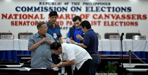 5月11日,在菲律賓首都馬尼拉,選舉委員會(huì)主席何塞·梅洛(前左)準(zhǔn)備召開(kāi)新聞發(fā)布會(huì)。菲選舉委員會(huì)當(dāng)日凌晨公布的總統(tǒng)選舉投票最新統(tǒng)計(jì)結(jié)果顯示,阿基諾三世獲得1192萬(wàn)張選票,比排名第二的前總統(tǒng)埃斯特拉達(dá)得票高出438萬(wàn)票,阿基諾三世獲勝已成定局。新華社/法新