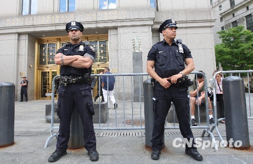 5月4日,紐約曼哈頓區(qū)聯(lián)邦法庭外,兩名警察嚴陣以待。據美國媒體報道,企圖制造5月1日美國紐約時報廣場汽車炸彈案的嫌犯費薩爾·沙赫扎德,將于當天在該法庭受審。據了解,費薩爾·沙赫扎德將被控以恐怖主義和企圖使用大規(guī)模殺傷性武器等罪名。但有最新消息稱,由于嫌犯已經對所犯罪行供認不諱,并積極配合警方調查,4日的庭審可能將延期舉行。 中新社發(fā) 魏晞 攝