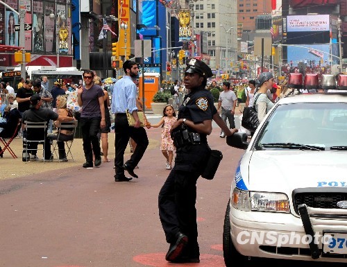5月2日,紐約時報廣場依舊人流如織,絲毫不受1日晚間那一沒被引爆的汽車炸彈事件影響。但2日時報廣場警力增多,圖為女警在廣場巡視。1日晚間,一輛停于時報廣場的日產車冒煙并發(fā)出輕微爆破聲,附近的小販報警后,紐約警察從車內清理出大量爆炸物,幸而沒引發(fā)更大的災難,紐約市長彭博稱“躲過一劫”。 中新社發(fā) 孫宇挺 攝