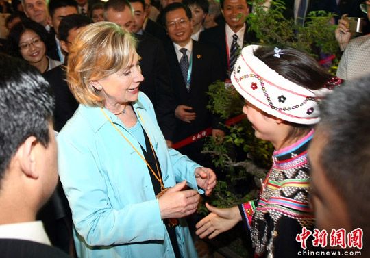 5月22日,美國國務卿希拉里·克林頓參觀上海世博會中國館,與云南館少數民族演員交流。