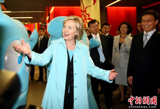 5月22日,美國國務卿希拉里·克林頓參觀上海世博會中國館,與吉祥物“海寶”互動。