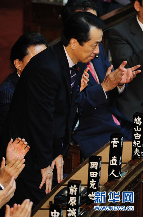 6月4日,日本執政的民主黨新代表(黨首)菅直人在國會參議院首相指名選舉中當選新一任首相。這是菅直人當日早些時候在眾議院獲得首相提名后致意。新華社記者季春鵬攝 日本新當選首相菅直人4日晚在民主黨黨部對媒體表示,將調整財政投入的重點,把有限的財源投放到啟動需求、擴大就業等重點領域。他相信,只要確保日本財政的可持續性,日本經濟就將走上“成長的軌道”。