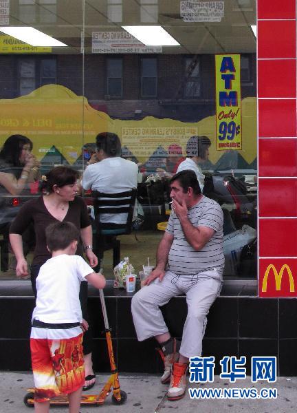 6月4日,市民在美國紐約的一家麥當勞連鎖店門前用餐。美國快餐業巨頭麥當勞公司當天宣布召回至少1330萬個印有《怪物史萊克4》圖案的玻璃杯。這些玻璃杯表面可能含有對人體有害的重金屬鎘。新華社發(吳凱翔攝)