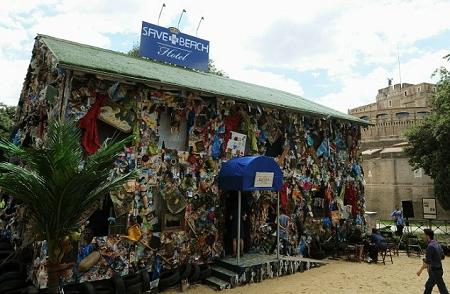 這家酒店名為“保護海灘”,位于臺伯河畔圣安琪兒古堡旁,出自德國藝術家哈·舒爾特之手。它共有5個房間,用去12噸垃圾,其中包括塑料袋、漁網、舊衣服、玩具、易拉罐等,甚至包括一只搖擺木馬和人體模型的一條腿。