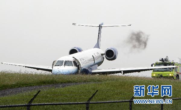 6月16日,工作人員在加拿大渥太華國際機場檢查滑出跑道的美聯航飛機。機場新聞發言人當天說,這架由巴西航空工業公司制造的飛機從美國華盛頓飛抵渥太華時滑出跑道,但沒有造成人員死亡或重傷。 新華社/路透