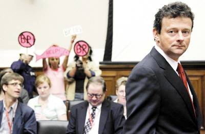 資料圖片:6月17日,英國石油公司首席執(zhí)行官托尼·海沃德(右)在出席美國國會(huì)聽證會(huì)時(shí)遭遇抗議。(圖片來源:人民網(wǎng)-環(huán)球時(shí)報(bào))