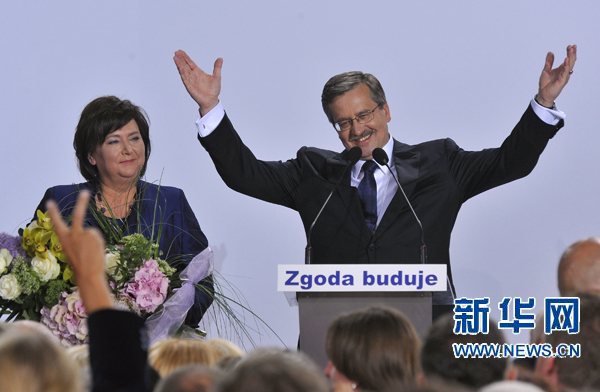 7月4日,波蘭代總統(tǒng)、眾議院議長、執(zhí)政黨公民綱領(lǐng)黨候選人布羅尼斯瓦夫·科莫羅夫斯基(右)在首都華沙競選總部向支持者致意。波蘭多家媒體4日晚公布的投票站出口民調(diào)顯示,在當(dāng)天舉行的波蘭總統(tǒng)選舉第二輪投票中,科莫羅夫斯基擊敗反對(duì)黨法律與公正黨主席、已故總統(tǒng)萊赫·卡欽斯基的孿生哥哥雅羅斯瓦夫·卡欽斯基,當(dāng)選波蘭總統(tǒng)。新華社記者武巍攝